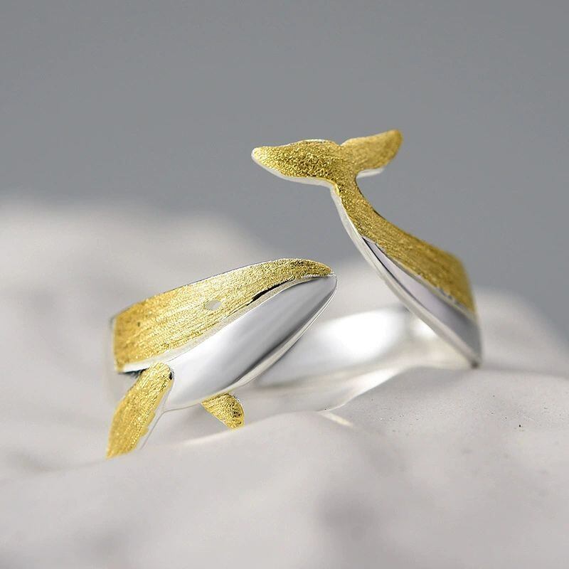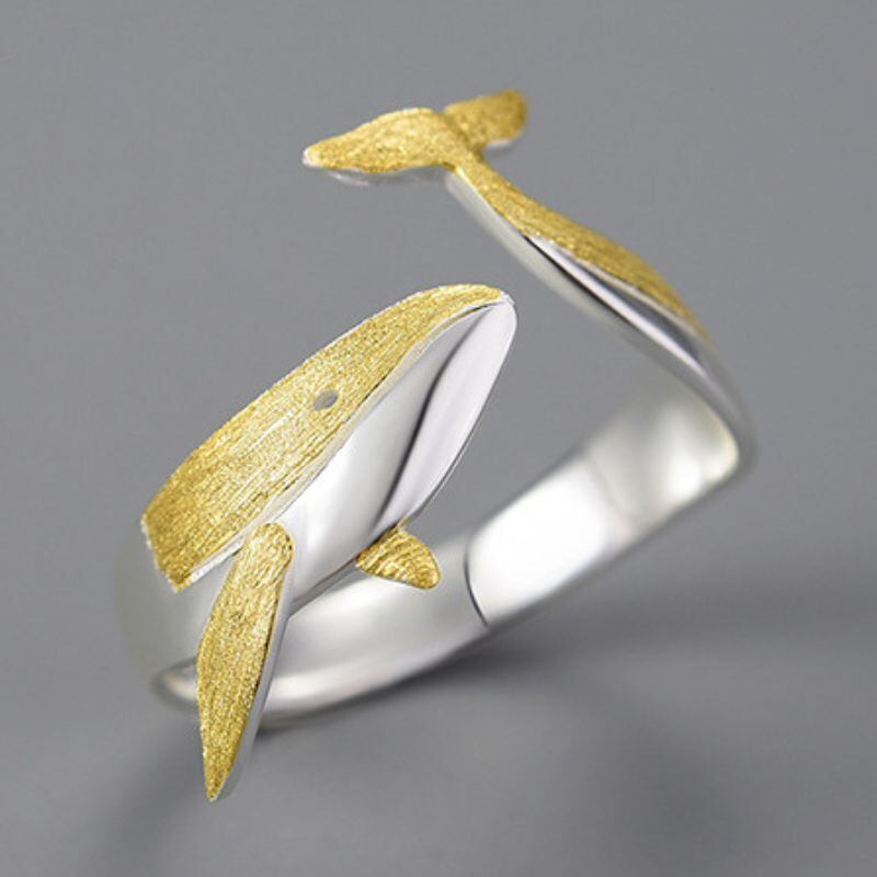 鯨をテーマにしたリングで、金色と銀色を用いて表現された魅力的なアクセサリーです。波の中を泳ぐようなデザインで、指に美しくフィットします。このリングは、海の不思議さと壮大さを思い出させてくれます。職人の手によって一つ一つ丁寧に作られており、ディテールにこだわった仕上がりが魅力です。普段使いにも特別な日の装いにもぴったりで、見るたびに心が和むアクセサリーです。