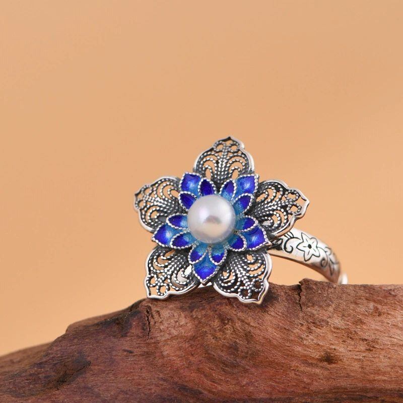 ペンタスの花のリングは、職人の手によって丁寧に作られており、ペンタスの花の持つ神秘的な美しさを際立たせています。唐草模様は伝統的な装飾技法を用いており、七宝焼きの色合いが優雅に輝いています。中央に配置されたパールは、洗練された印象を与え、特別な日を彩るのにぴったりのアクセサリーです。このリングを身につければ、個性と美しさが一層引き立つことでしょう。どんなスタイルにも合わせやすく、特別なギフトとしても最適です。