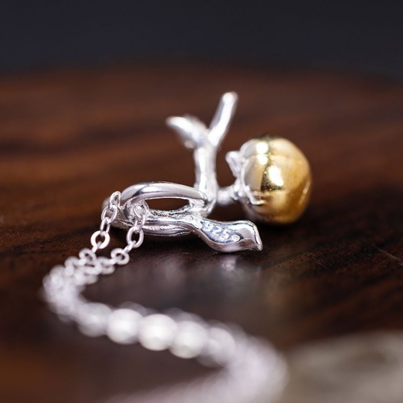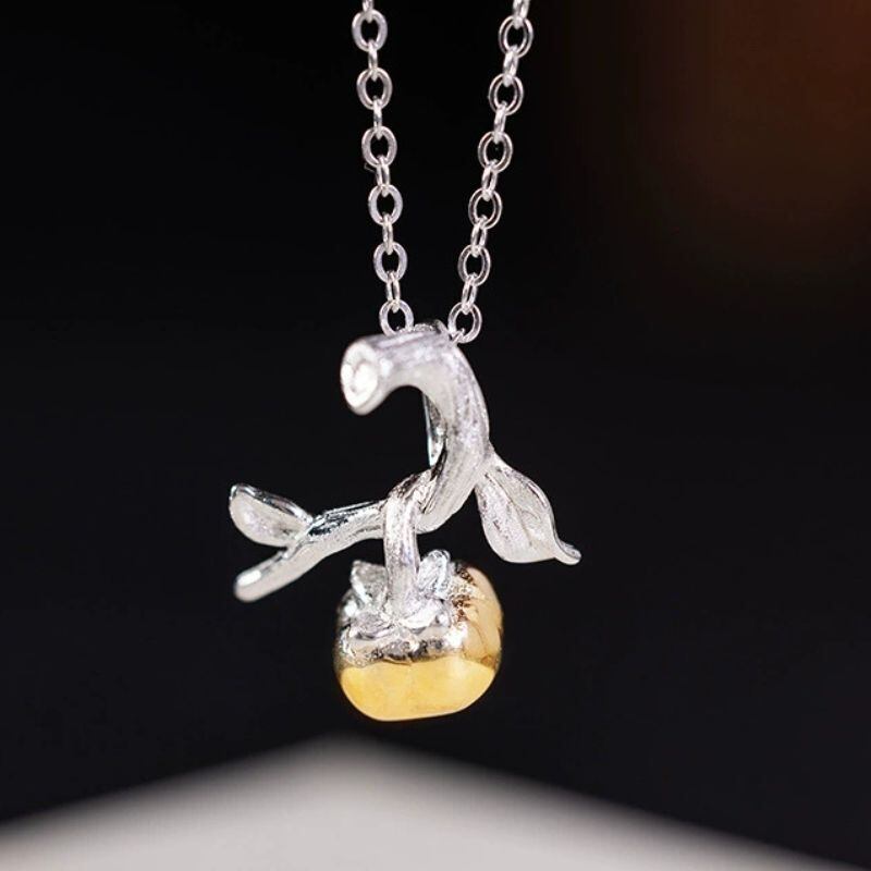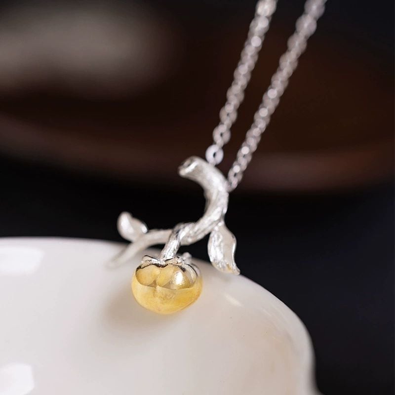柿のペンダントは、秋の訪れを感じさせる温かみのあるデザインで、身につける人に自然の美しさを届けます。葉っぱは繊細なディテールで、まるで本物の葉のように軽やかで優雅です。実は艶やかな質感で、豊かな収穫を象徴しています。このペンダントを身に着けることで、日常に季節の息吹を感じ、心に和やかさをもたらします。