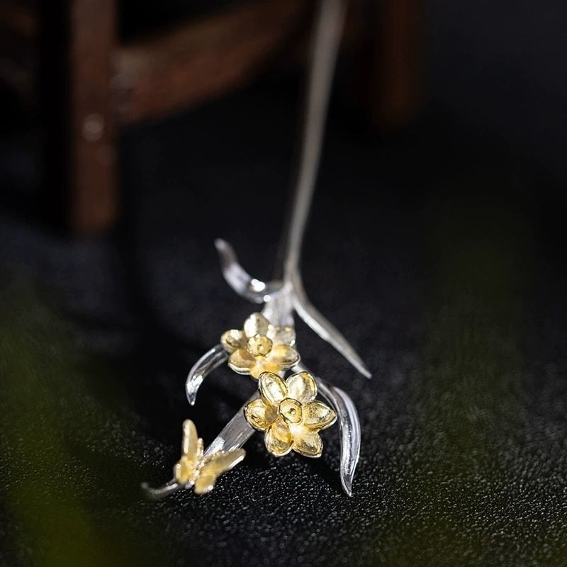 水仙の花のかんざしは、伝統的な美しさと現代的な感性が見事に調和しています。水仙の花びらは、繊細な彫刻と上品な色使いで、まるで本物の花が咲いているかのようです。葉っぱのデザインもまた、自然な形状と柔らかな曲線が魅力的で、全体に軽やかさと優雅さを添えています。このかんざしを身につけることで、装いに一段と華やかさが増し、特別な場面でも日常でも、洗練された印象を与えることでしょう。