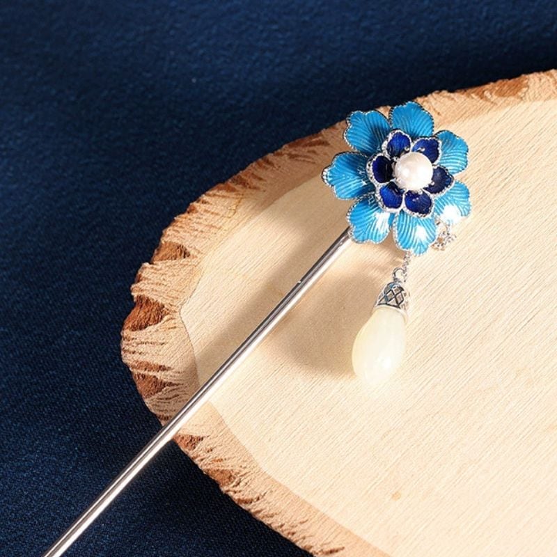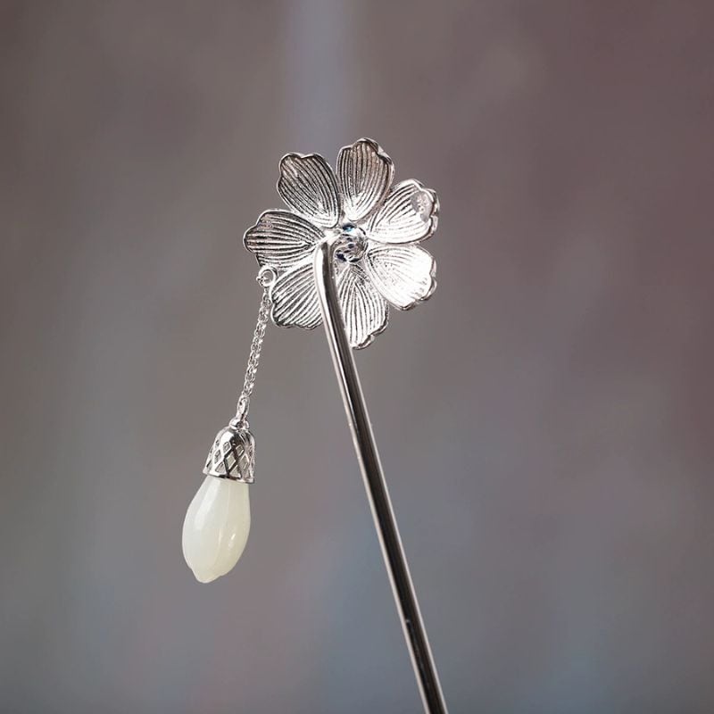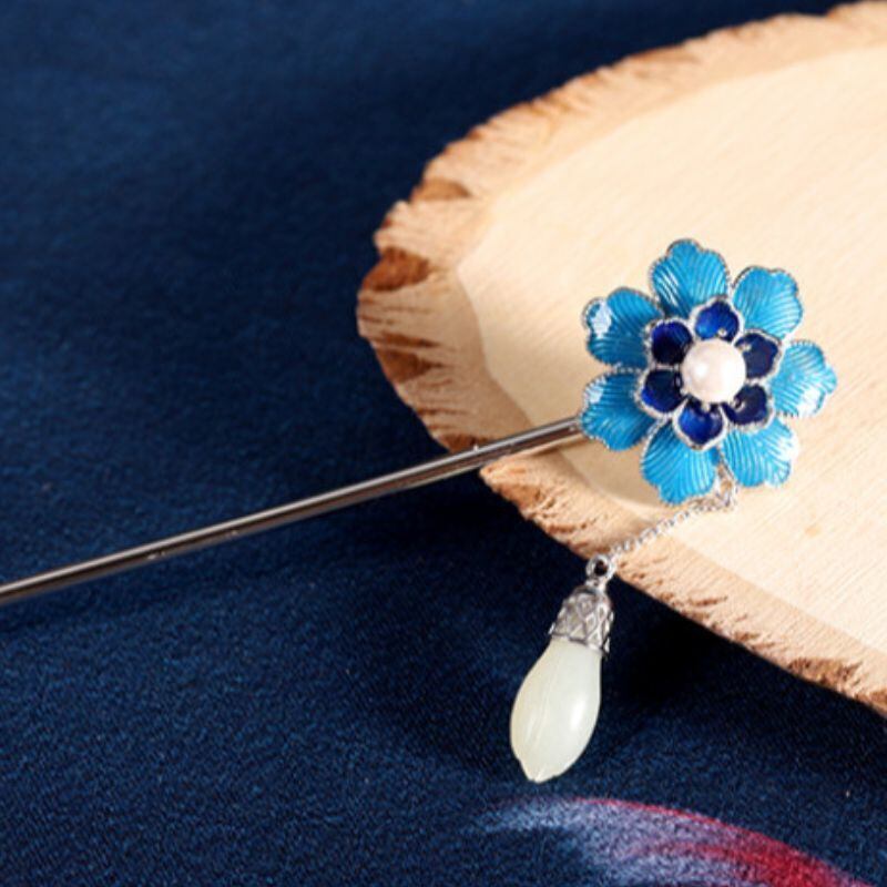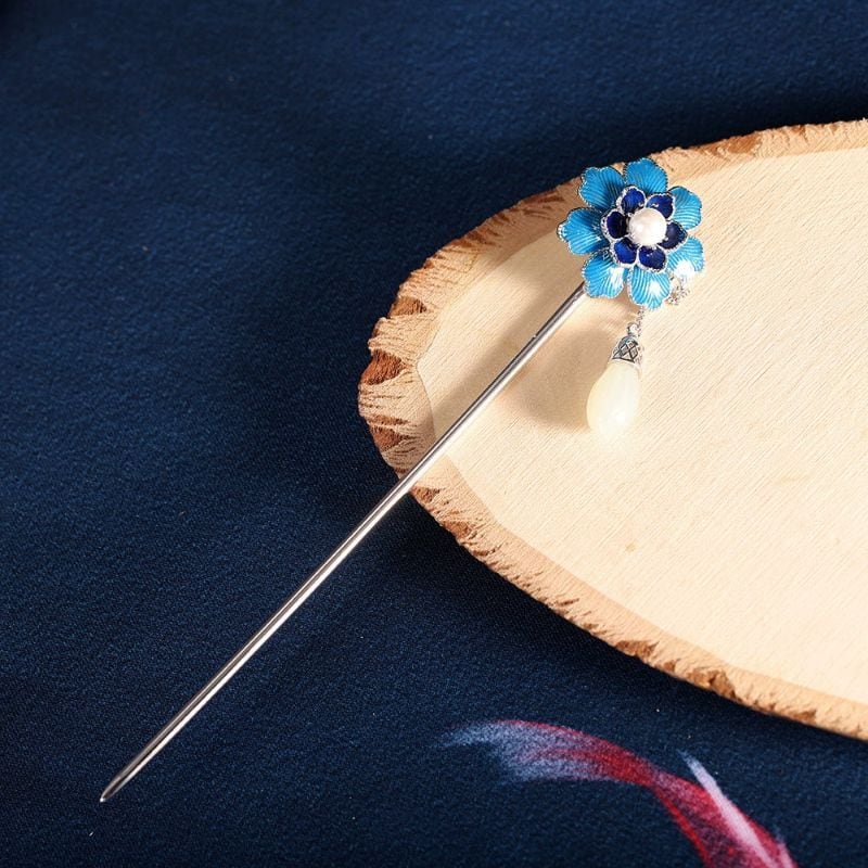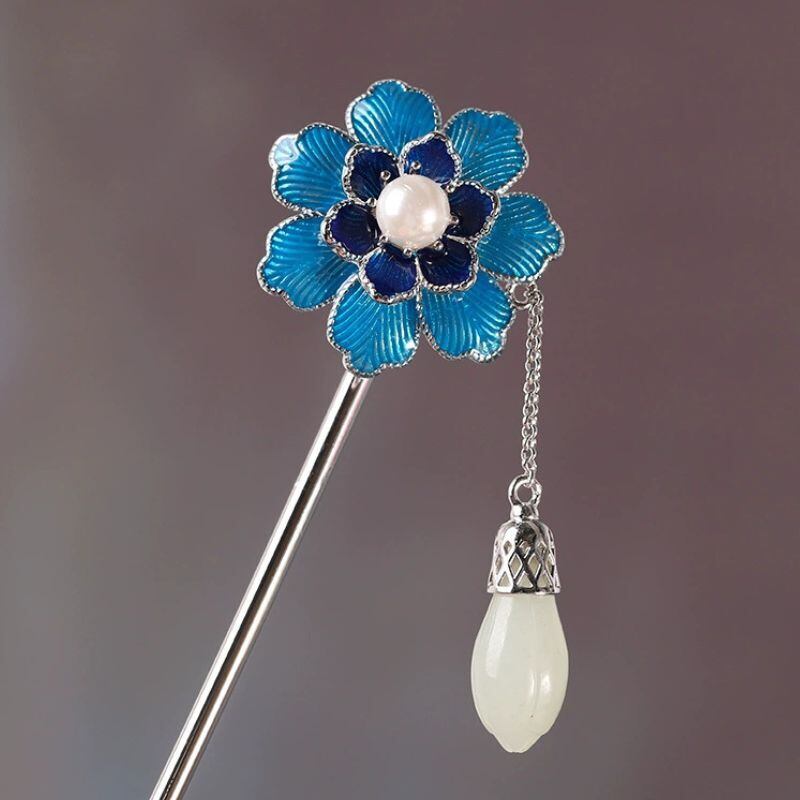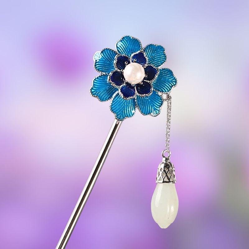 コスモスをテーマにしたかんざしで、シルバーの花に七宝焼きを施し、その中心にはパールがあしらわれたヘアアクセサリーです。下部の揺れる部分にはネフライトが使われており、洗練された印象を与えるかんざしに仕上がっています。職人の手によって一つ一つ丁寧に作られたこのかんざしは、古典的な美しさと現代的なエレガンスが見事に融合しています。和装にも洋装にも合わせやすく、多くの場面で活躍すること間違いなしです。日常の装いに特別な輝きを添えたいときや、特別な日の装いをより引き立てたいときに、このかんざしはその役割を果たしてくれることでしょう。