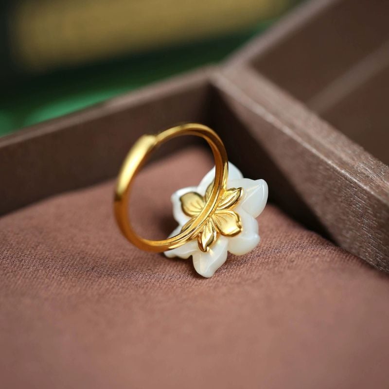水仙の花のリングは、優雅で洗練されたデザインが魅力的です。白蝶貝の花びらは、光を受けるたびに柔らかな輝きを放ち、見る人の目を引きつけます。中央に配置された翡翠は、軽やかな緑色が印象的で、自然の美しさをそのまま指先に運んでくれます。このアクセサリーは、特別な日の装いに華を添えるだけでなく、日常のスタイルにもエレガントなアクセントを加えることができます。身に着ける人に自信と優雅さを与えてくれる、まさに芸術品とも言える一品です。