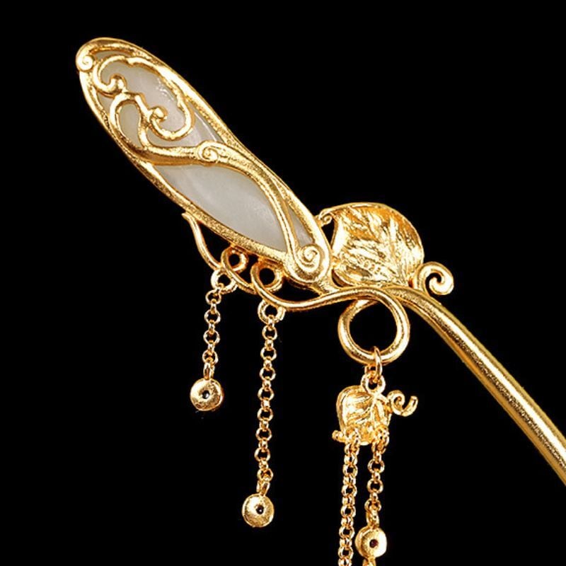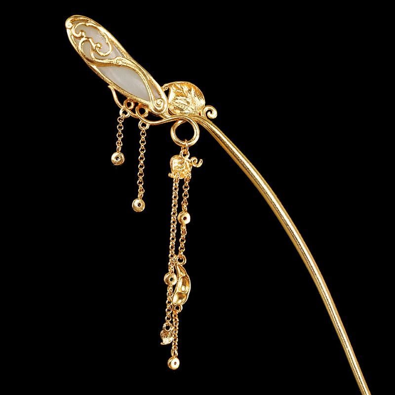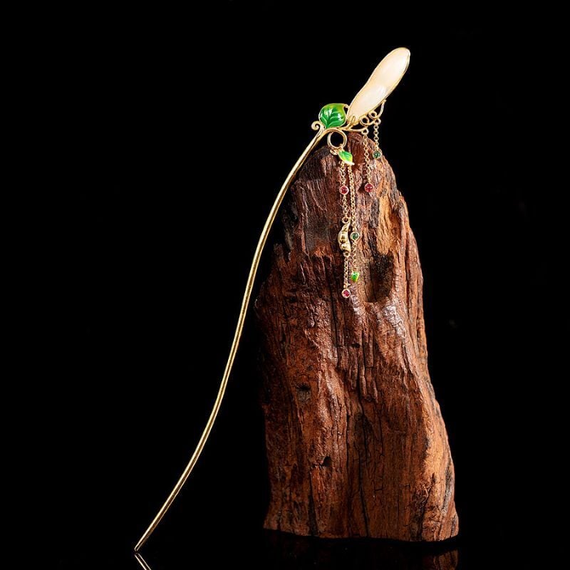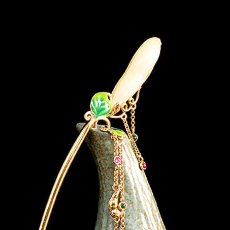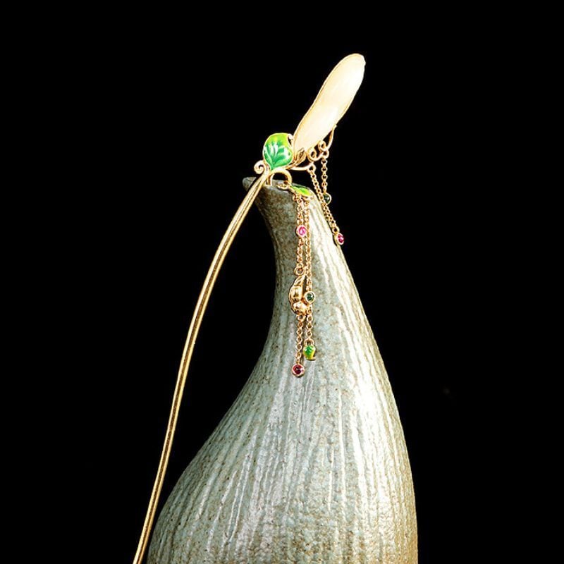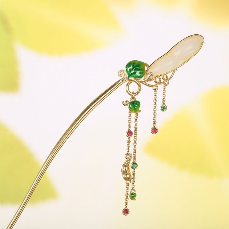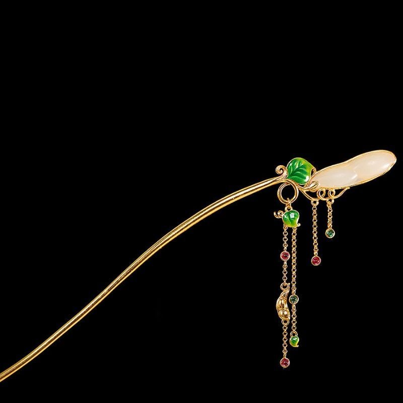 豆をテーマにしたかんざしでは、豆をネフライトで表現し、葉っぱは七宝焼で鮮やかな緑に仕上げました。全体のデザインは自然の美しさを引き立て、豆の形がとても愛らしく、和装にぴったりです。ネフライトの柔らかな光沢が豆の存在感を際立たせ、七宝焼の鮮やかな緑色が葉っぱに生気を与えています。このかんざしは、職人の技術と自然の調和を感じさせる特別な一品であり、特別な日の装いに優雅さを添えてくれることでしょう。