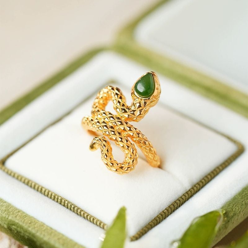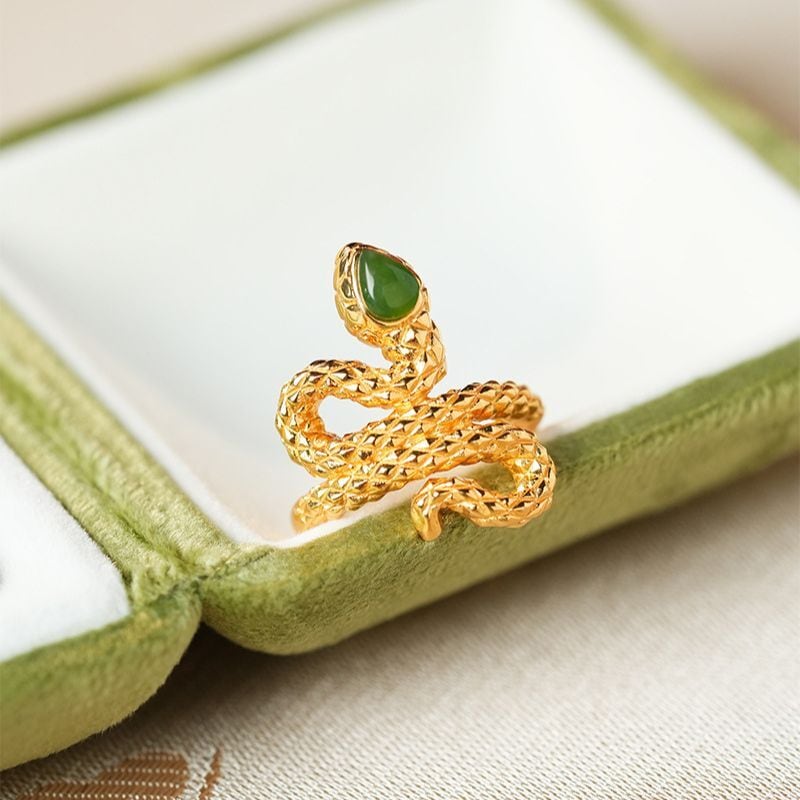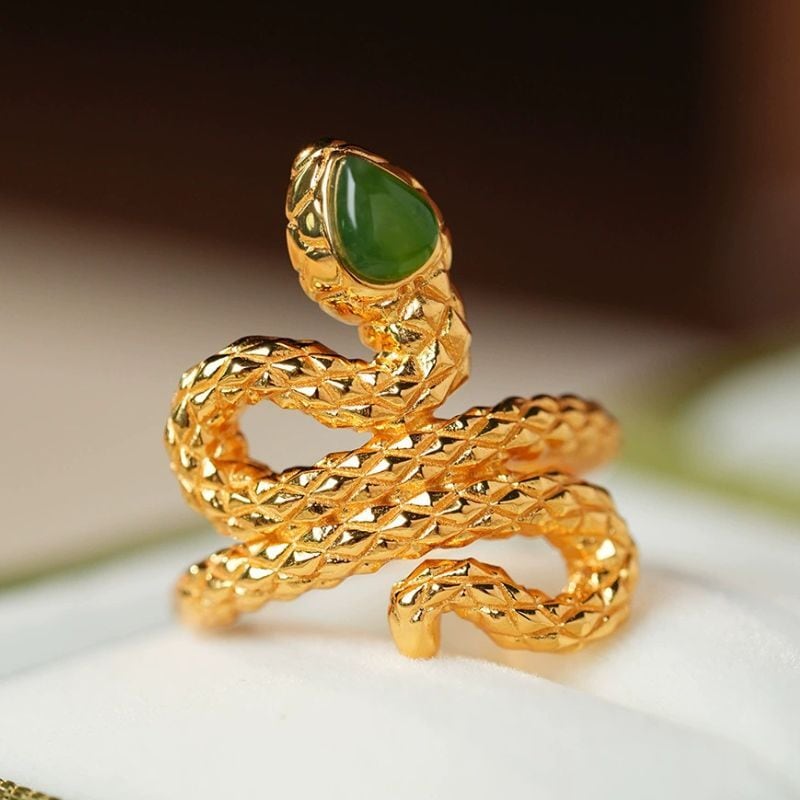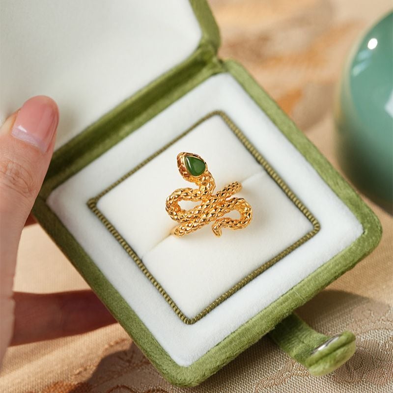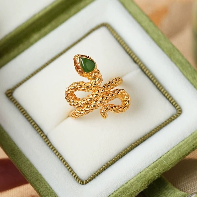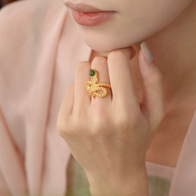 蛇からインスピレーションを受けてデザインしました。このリングは、蛇の本体に独自のディテールが施されており、さらに翡翠が頭部にセットされた洗練された作品です。このジュエリーは、神秘的な魅力と自然の美しさを融合させた一品です。翡翠は古来より幸運と調和を象徴する石として知られ、その深い緑色がリング全体に生命力を与えています。蛇の曲線は優雅でありながら力強く、指に巻きつくようにデザインされており、まるで指先に自然の力を宿すかのようです。このリングを身につければ、日常にスピリチュアルなエレメントが加わり、持ち主の個性とスタイルを引き立てることでしょう。大切な人への贈り物としても、自分自身へのご褒美としても、特別な存在感を放つアイテムです。感じることができます。