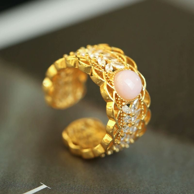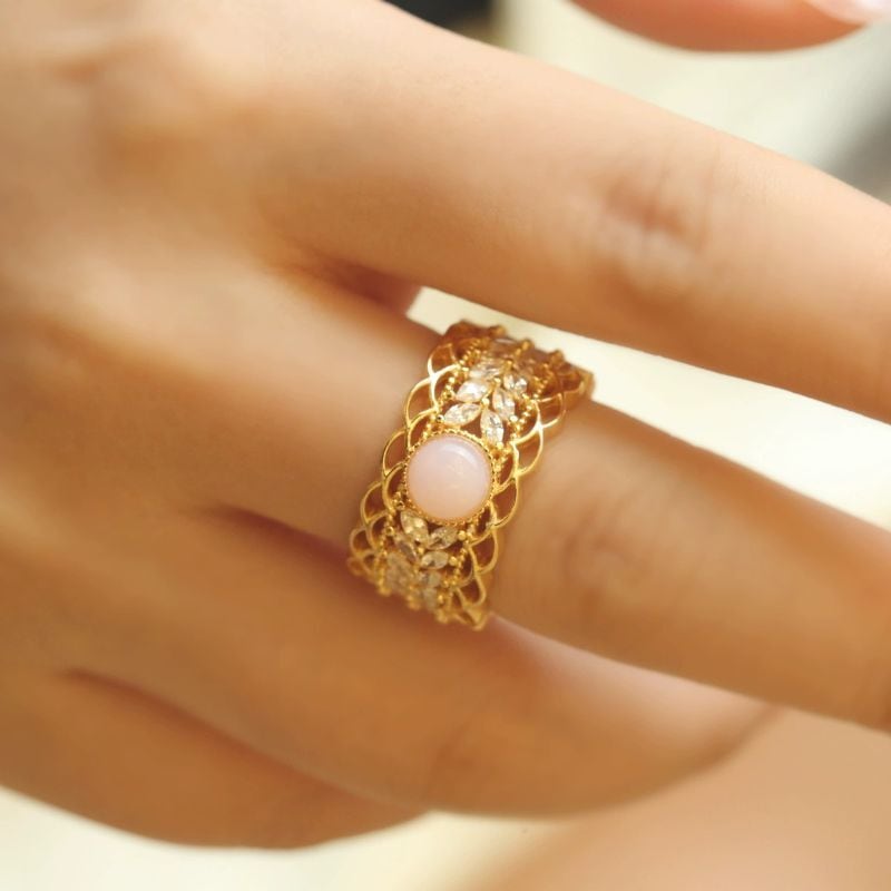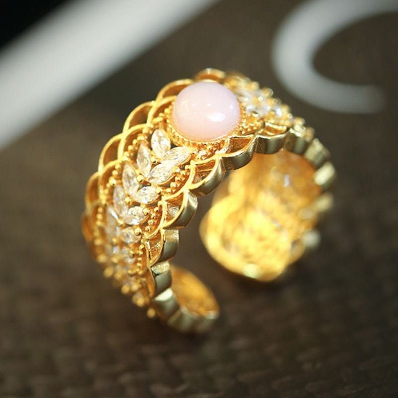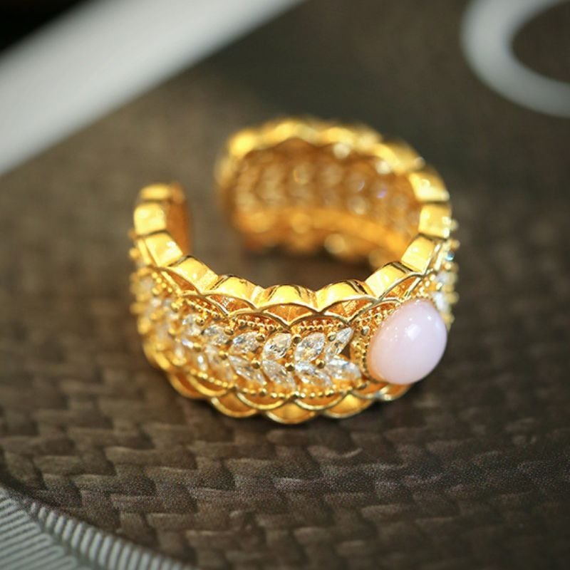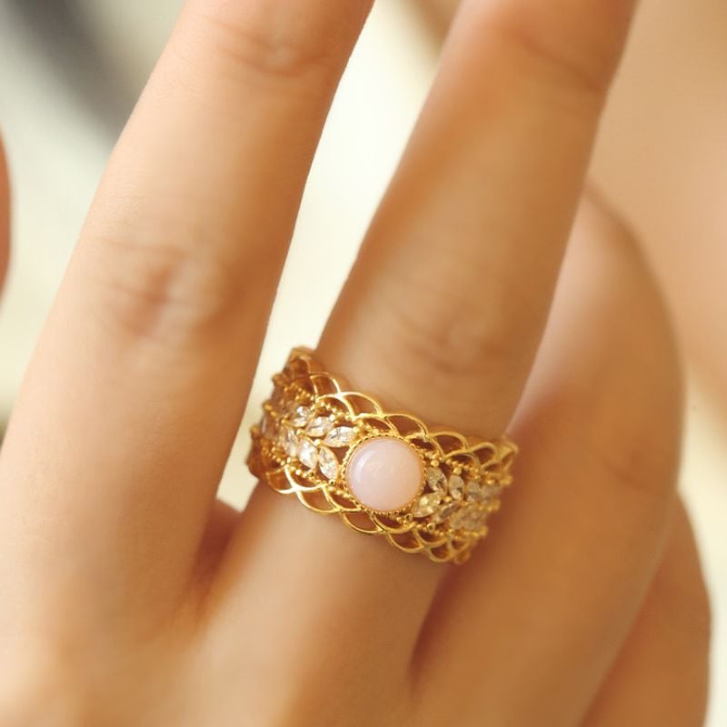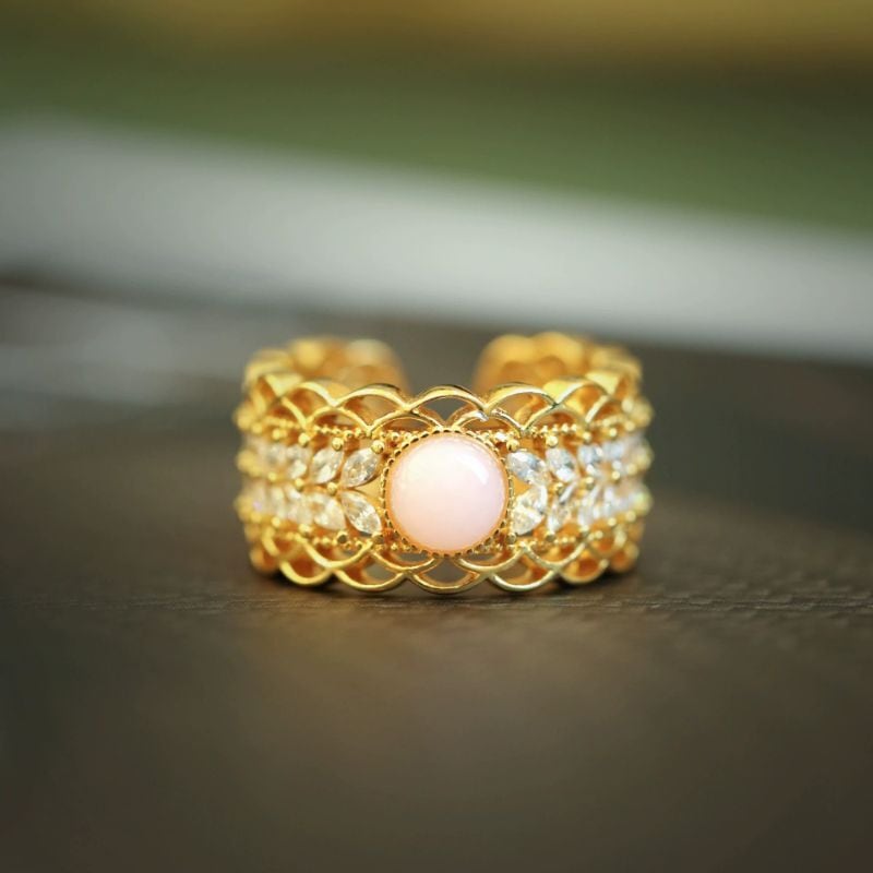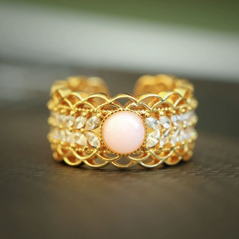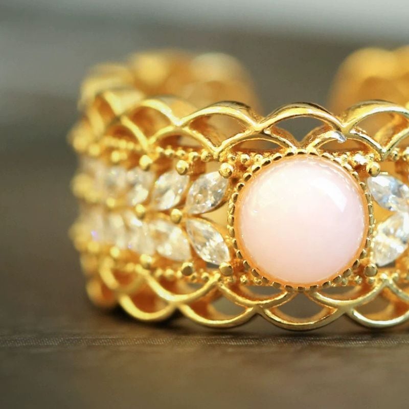 繊細で上品な透かし模様のレースリングです。マーキースカットの石が美しく並び、中央にはピンクオパールがスタイリッシュにセットされています。このリングは、まるで芸術作品のようにデザインされています。繊細なディテールが施されており、着ける人の指先に優雅な輝きを与えます。ピンクオパールの柔らかく上品な色合いは、どんな肌色にもマッチし、日常を特別なものに変えてくれるでしょう。また、マーキースカットの石が光を受けてキラキラと輝き、見る人の心をつかんで離しません。このリングは、特別な日のギフトとしても、自分へのご褒美としても最適です。
