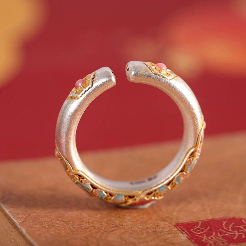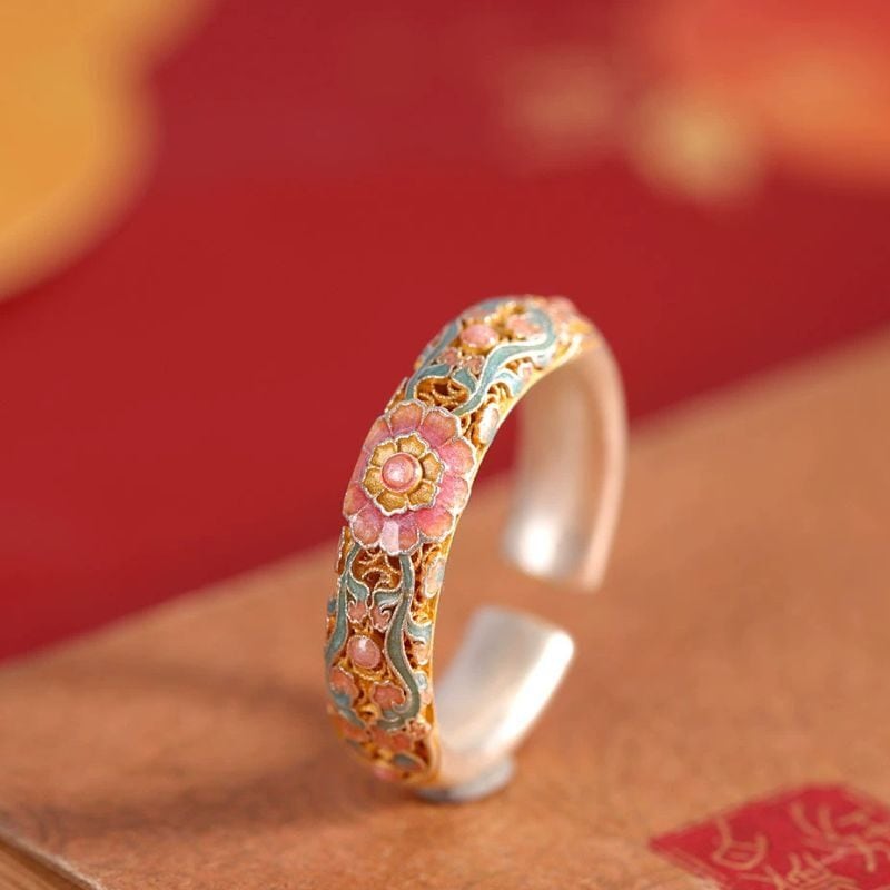 七宝焼が施されたリングは、花をモチーフにしたデザインで、柔らかな色合いが特徴です。このリングは、職人の手によって一つ一つ丁寧に作られており、その美しさは見る者を魅了します。自然の美しさを指先にまとえるこのリングは、特別な日のお祝いにも、日常の装いにも華やかさを添えてくれることでしょう。