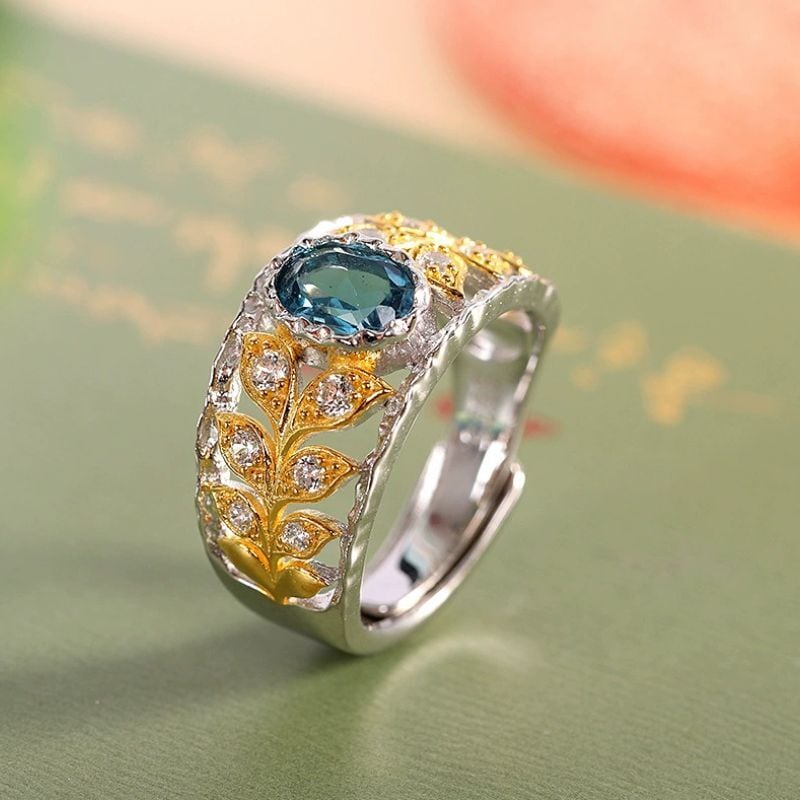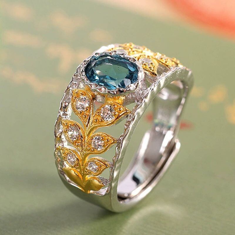 - ブルートパーズリング - 自然の優雅さを表現する葉のデザイン R459