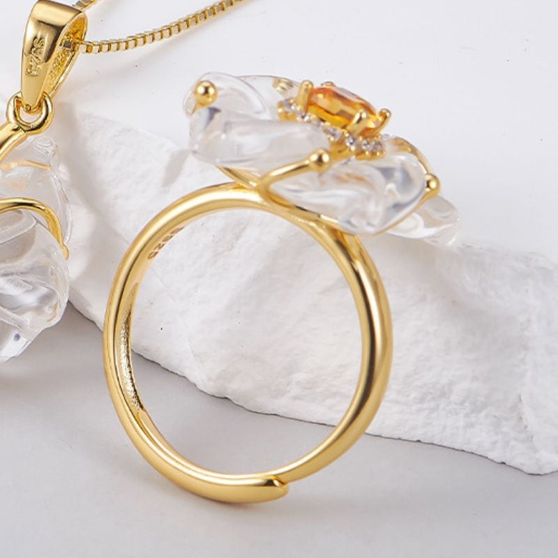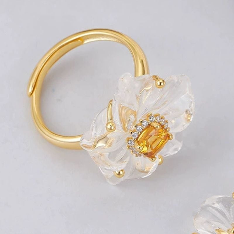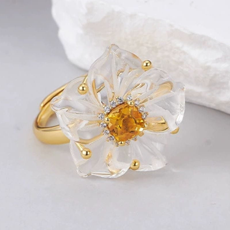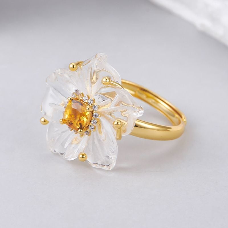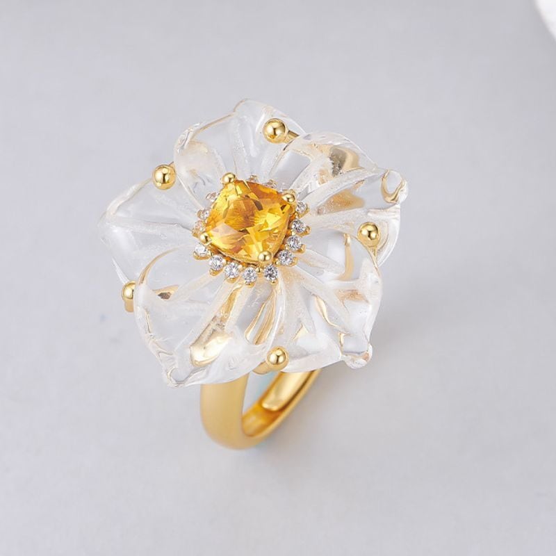 バイカイチゲをインスパイアしたリングで、水晶製の花びらにシトリンをあしらった洗練されたアクセサリーです。このリングは、まるで春の訪れを指先に纏うかのようなデザインで、見る人の心を和ませます。透明感のある水晶の花びらは光を受けて煌めき、その中心にあるシトリンは暖かみのある黄金色で、持つ人に豊かさと幸運をもたらすと言われています。このアクセサリーは特別な日にも日常使いにも最適で、身に着けることで自然の美しさを感じさせる一品です。