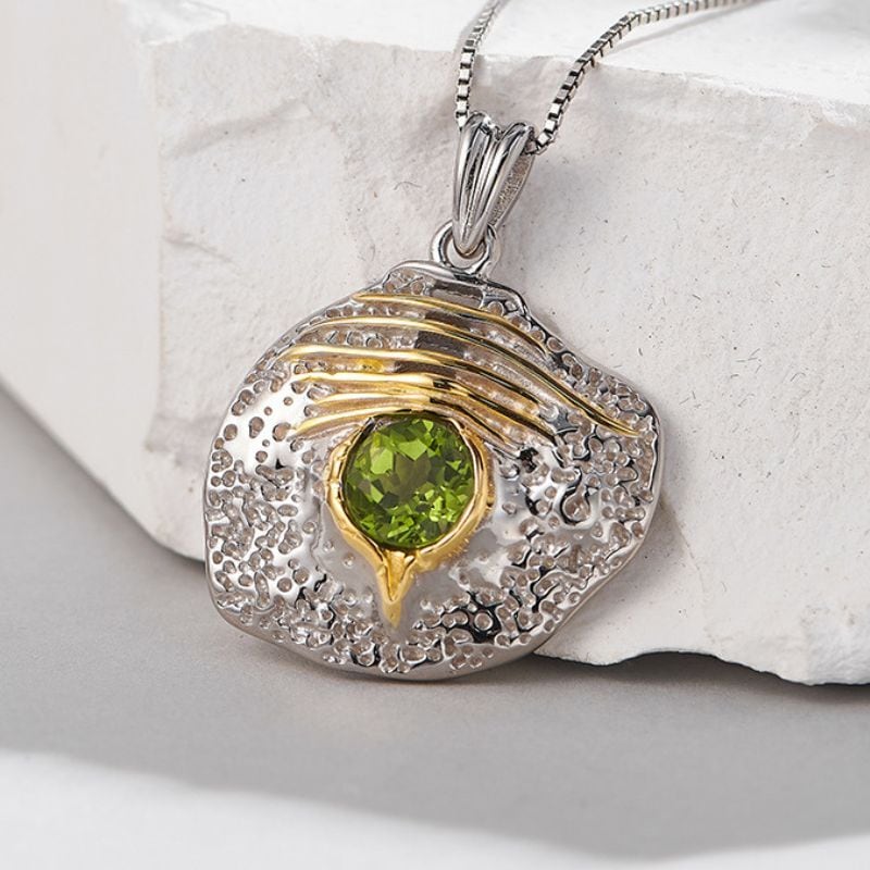 ユニークなラインとテクスチャーが施された、ペリドットを中心にあしらった素晴らしいペンダントです。このペンダントは、自然の美しさと職人技を融合させた逸品です。ペリドットの鮮やかな緑色が目を引き、どんな装いにも華やかさを添えてくれます。細部までこだわったデザインは、日常のアクセントとしても特別な日の装いとしても、上品さとエレガンスを引き立てます。このジュエリーを身に着けることで、身も心も輝きに満ちることでしょう。