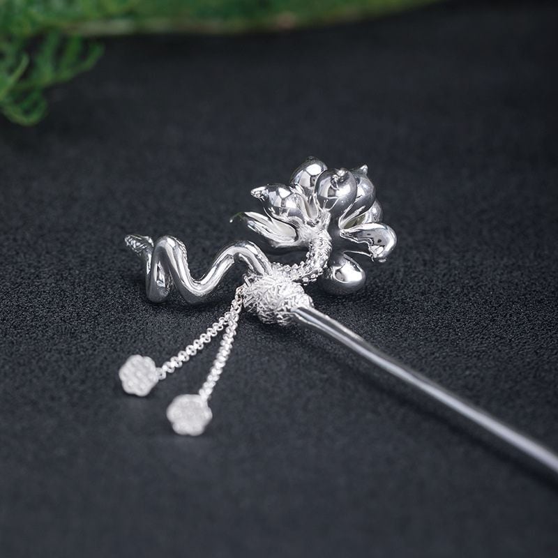 このシルバーかんざしは、日本の伝統的な美しさと現代のデザインが見事に融合されています。蓮の花は清らかさと高潔さを象徴し、蛇は再生や変化を意味します。その象徴的な要素が組み合わさって、エレガントでミステリアスな雰囲気を醸し出しています。ネフライトの花は、緑の色合いが清涼感をもたらし、シルバーの輝きと調和しています。髪に留めるだけで、おしゃれなアクセントが加わり、特別な日や普段使いにもぴったりなアイテムです。このかんざしを身につけることで、あなたの魅力がさらに引き立つこと間違いありません。