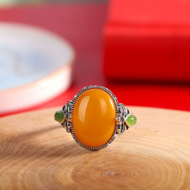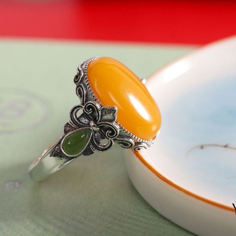 - 琥珀のリング - 琥珀の暖かみとネフライトの深い緑が見事に調和 R350